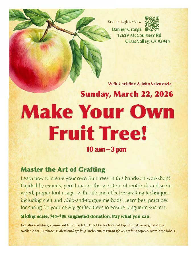 Join the Felix Gillet Institute, Sierra Permaculture Guild, Banner Grange and the Sierra Foothills chapter of California Rare Fruit Growers (CRFG) for an informative and family oriented Seed and Scion Swap with on-site demonstrations and food.